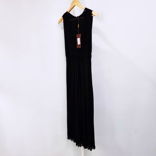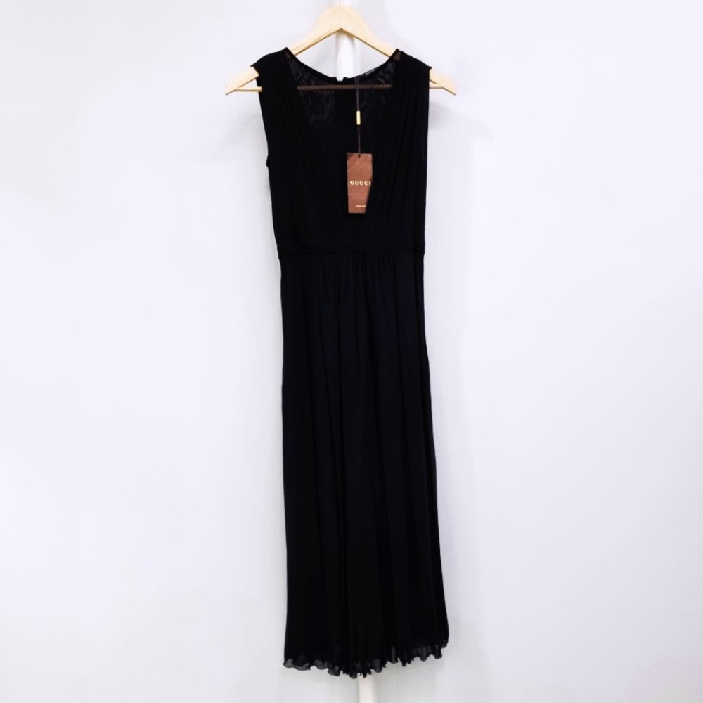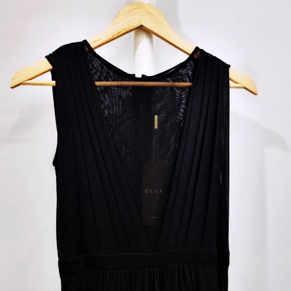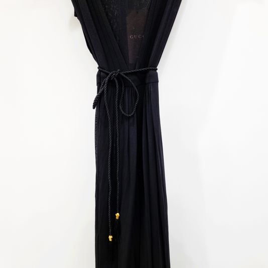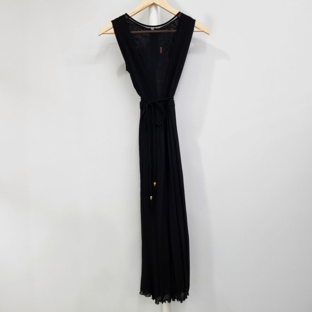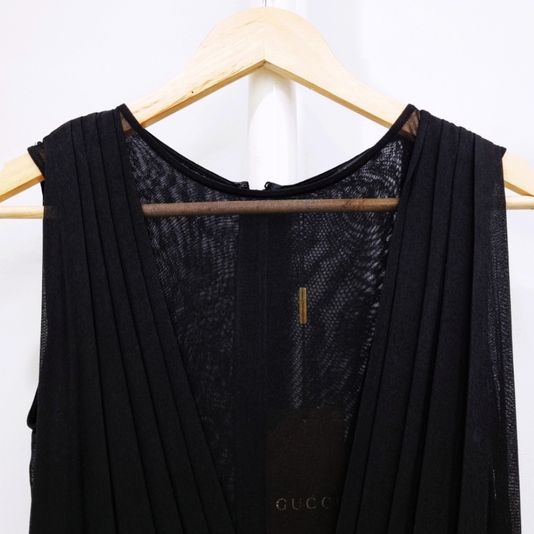 [33-44] 구찌 시스루 V넥 플리츠 슬리브리스 실크 롱원피스 블랙